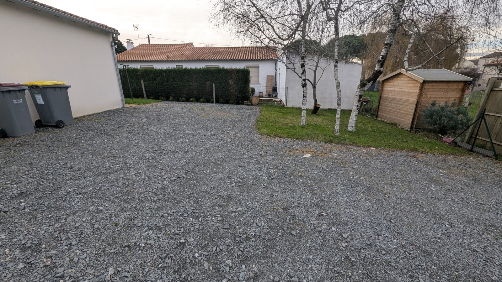 Garage attenant, terrasse, espace de stationnement, cabanon de jardin.