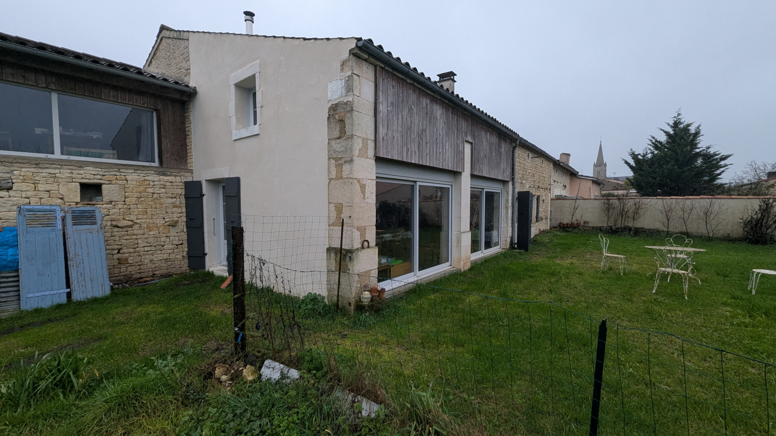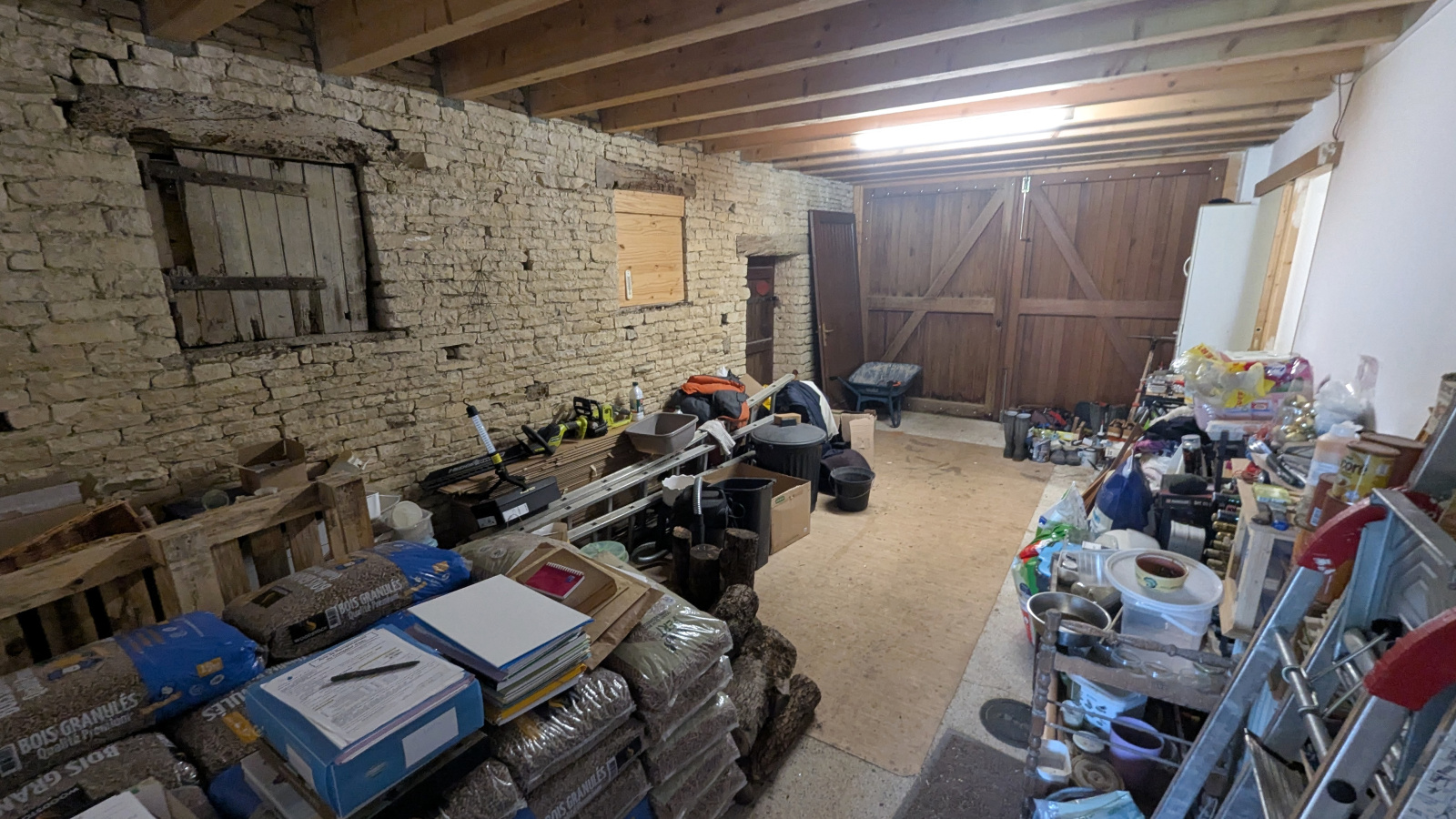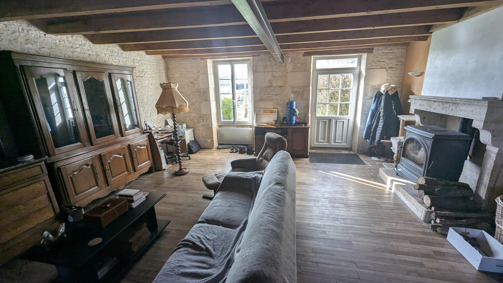 LE VANNEAU IRLEAU Maison d'habitation en pierres d'environ 149 m² habitable comprenant au rdc : entrée sur salon avec son poêle à bois, cuisine aménagée, séjour avec son poêle à, granules, wc indépendant salle d'eau, garage, buanderie cellier et accès à une autre dépendance.