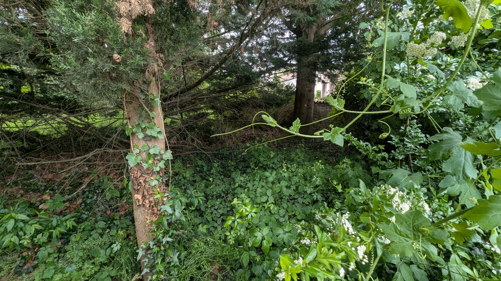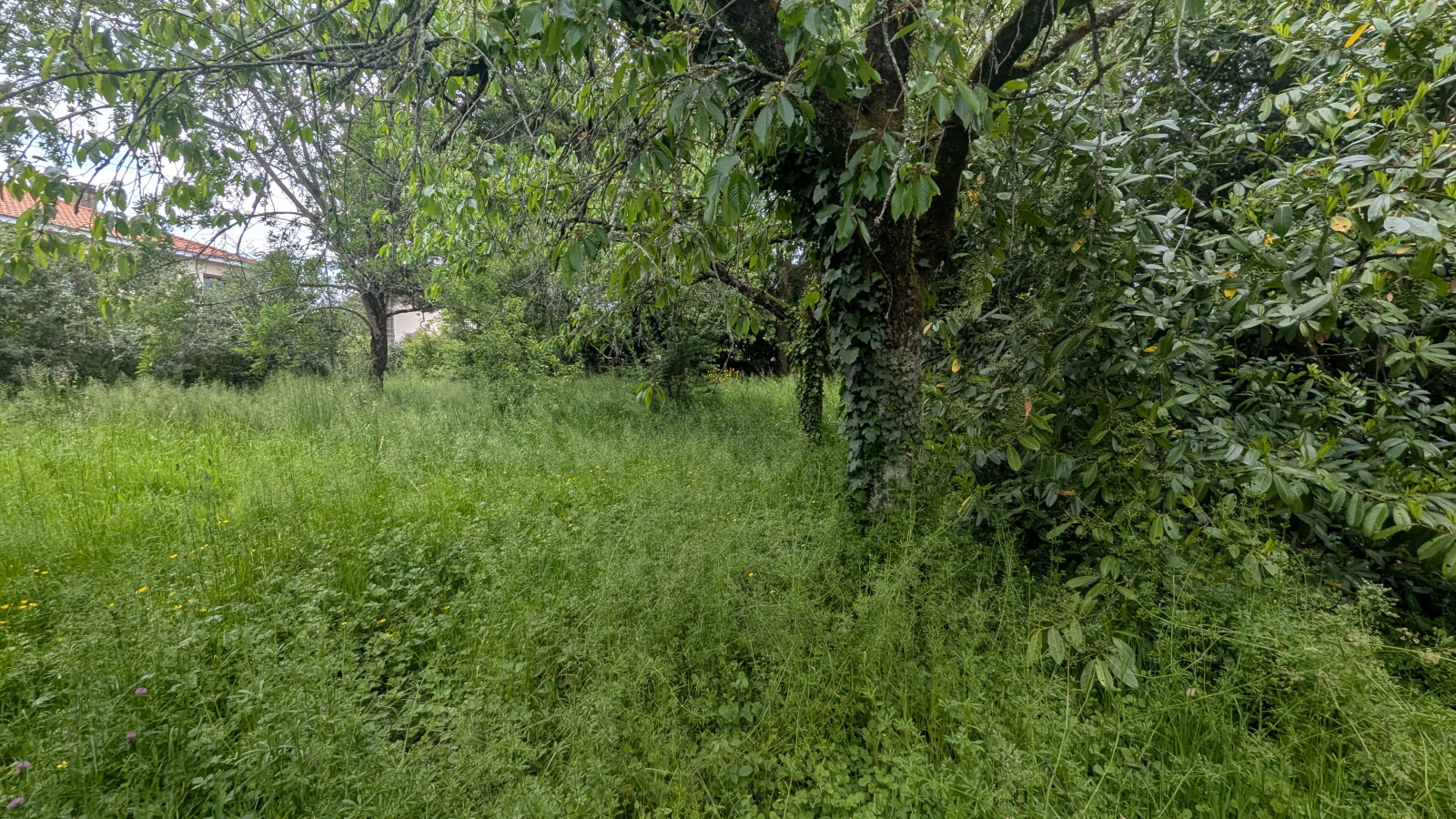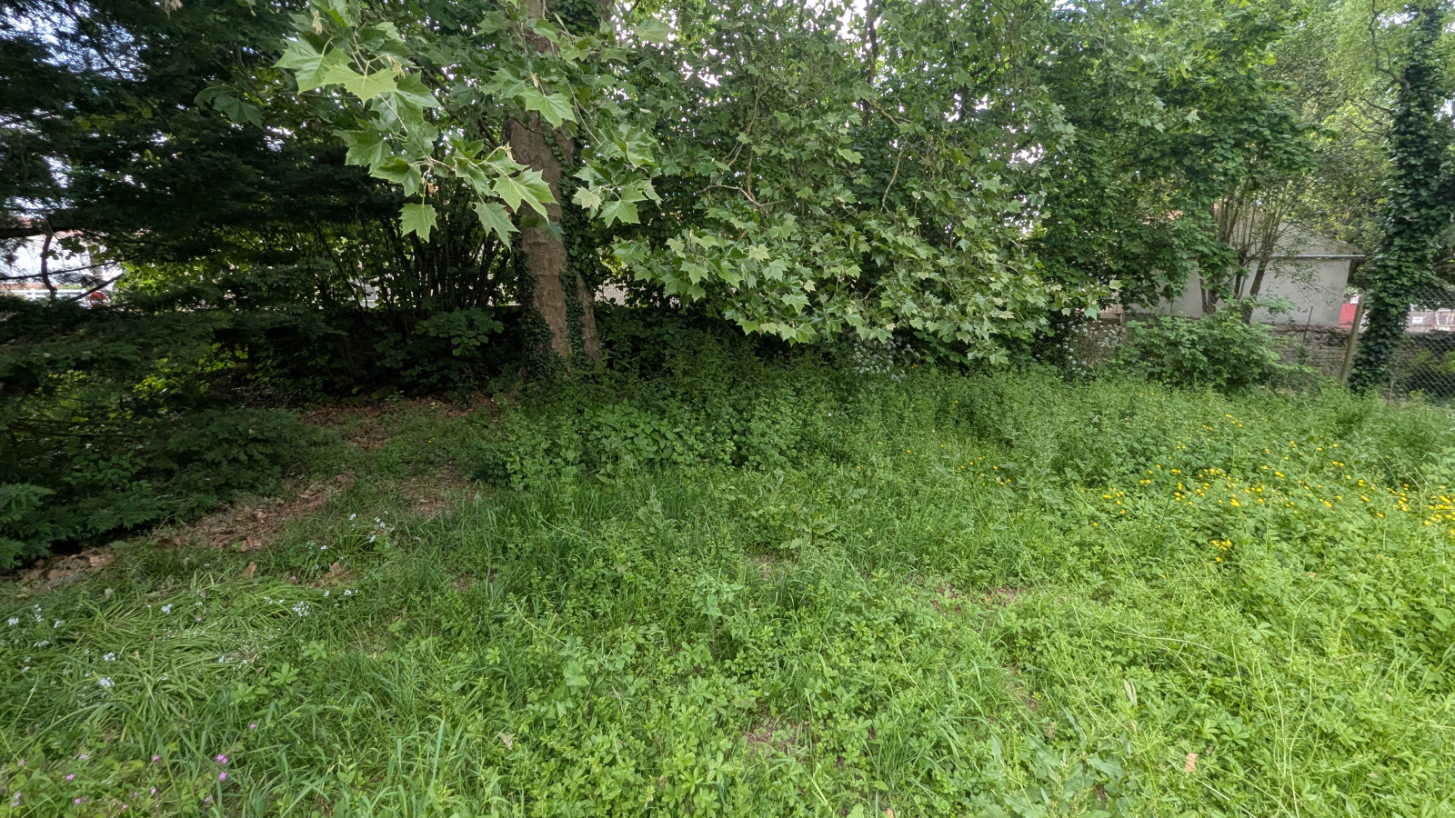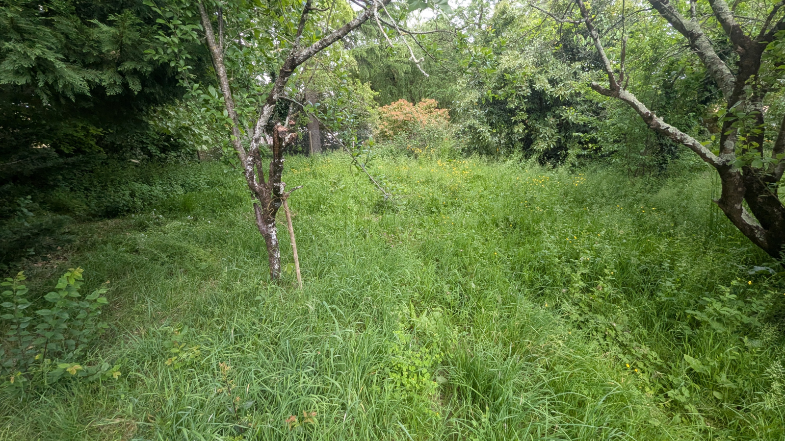 Terrain constructible non viabilisé (accès réseau devant sur route), zone classée Bâtiment de France, terrain arboré.